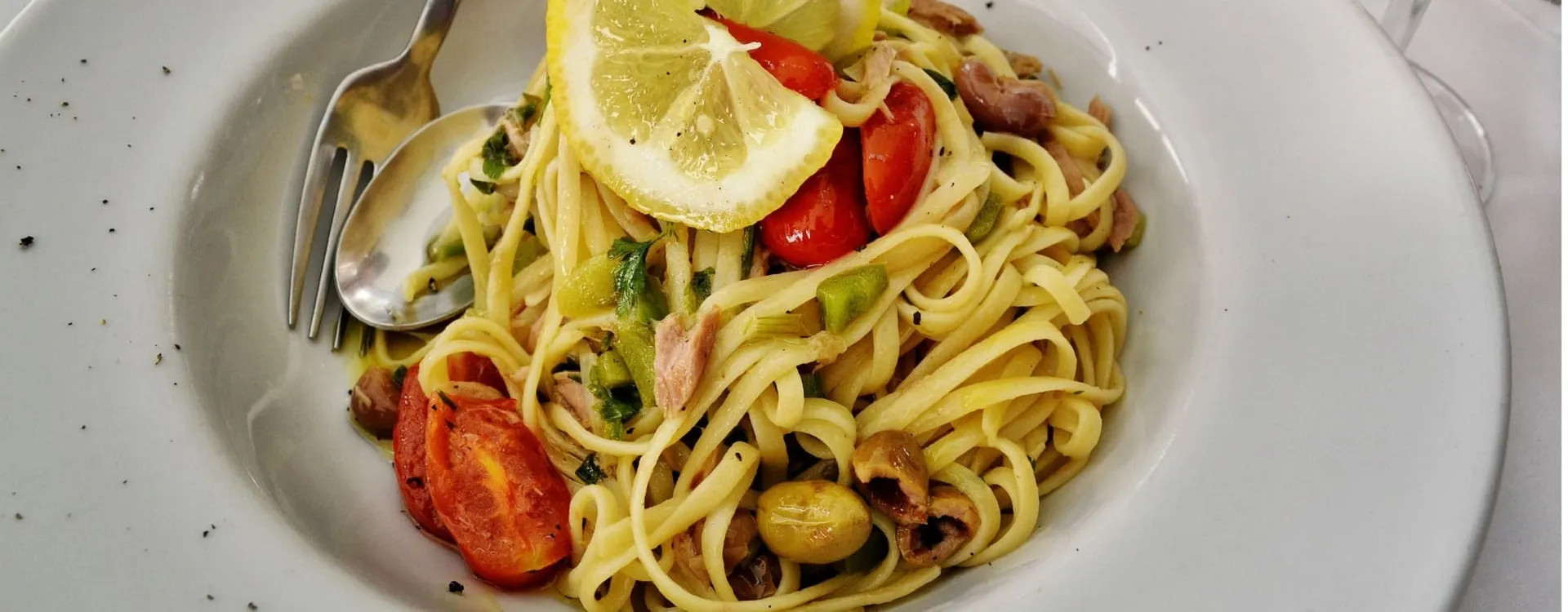 Le linguine al dente si fondono armoniosamente con una salsa fresca e gustosa preparata con pomodori San Marzano succosi, tonno sott'olio, olive nere denocciolate e capperi, il tutto condito con aglio leggermente soffritto e peperoncino per un tocco di vivacità.